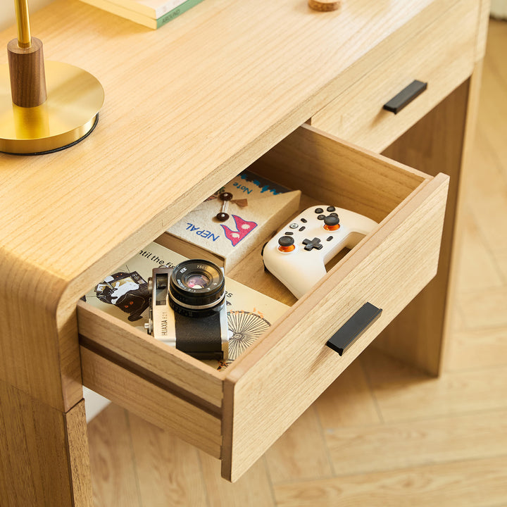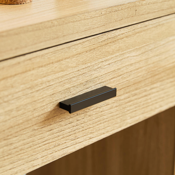 Mit ihrem skandinavischen Design und der Holzstruktur hat die Konsole SKIVE alles, was Sie brauchen, um Ihr Zuhause zu verschönern. Ob im Esszimmer, im Schlafzimmer, im Büro oder im Wohnzimmer, sie wird ihren Platz finden. Seine 2 Schubladen bieten praktische Aufbewahrungsmöglichkeiten mit Stil. Die Griffe sind aus Metall mit einer Epoxydharzbeschichtung. Seine Holzstruktur mit Buchenholzbeinen sorgt für Stabilität und Stoßfestigkeit. Er ist pflegeleicht, ein feuchtes Tuch genügt, um ihn zu reinigen.